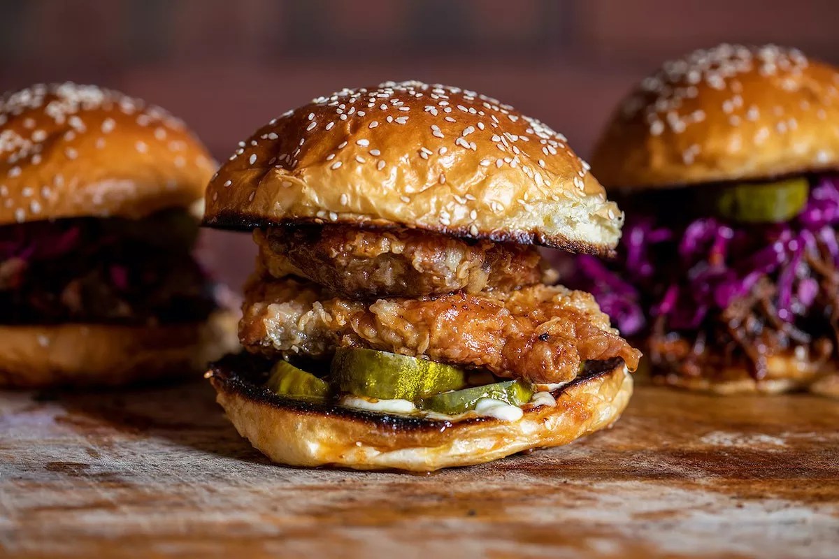 Izzy’s Brooklyn Smokehouse sandwiches include a popular fried smoked chicken sandwich and a pulled beef topped with coleslaw, pickles, and the house barbecue sauce.