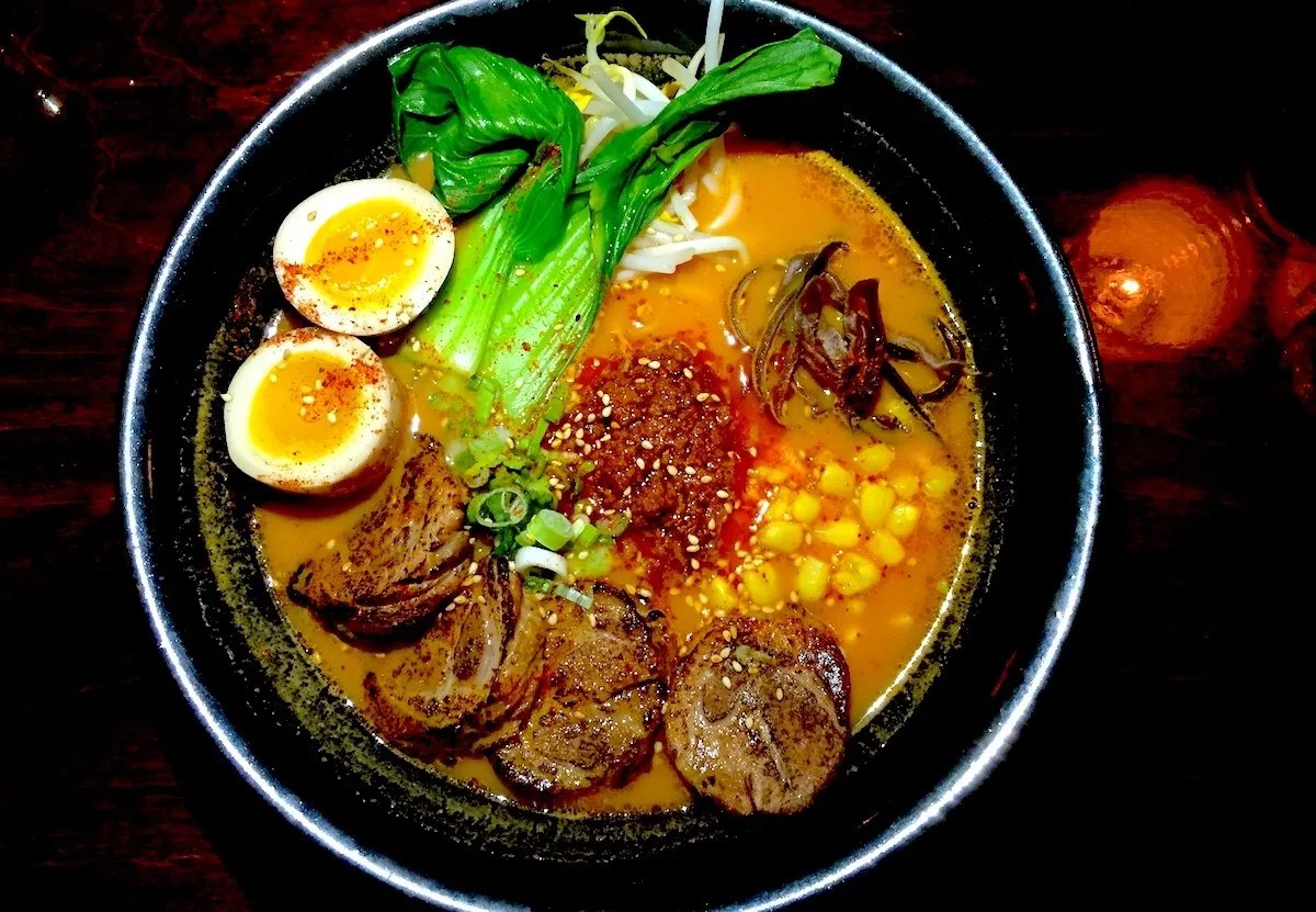 noriboca.com At Nori Thai, ramen is a veritable meal, served in giant white ceramic bowls topped to the brim with pork or seafood-infused broth and mounds of chewy-soft crimped Japanese noodles. Options include a traditional tonkotsu, a sesame-and-garlic-oil-infused broth rife with fatty chunks of pork, large cuts of broth-infused bok choy, a fistful of tender bean sprouts, sheets of seaweed, half a boiled egg, and large slices of kikurage mushroom. Thai green curry ramen is simmered in fresh basil and fish-infused green curry sauce before serving, then paired with bamboo, zucchini, red bell peppers, and the fresh catch of the day. A spicy version marries a Thai broth with lime, fish sauce, fried garlic, crushed peanuts, cilantro, and scallions before it’s topped off with shrimp, scallops, squid, and mussels. But the best is the spicy miso ramen, a tonkotsu broth flavored and thickened with a spicy bean paste for a kick of heat, then finished with the standard tonkotsu accouterments.