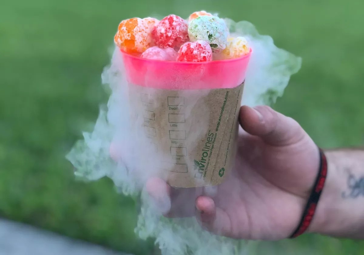 Colored cereal that smokes from liquid nitrogen served by Tornado Foods food truck.