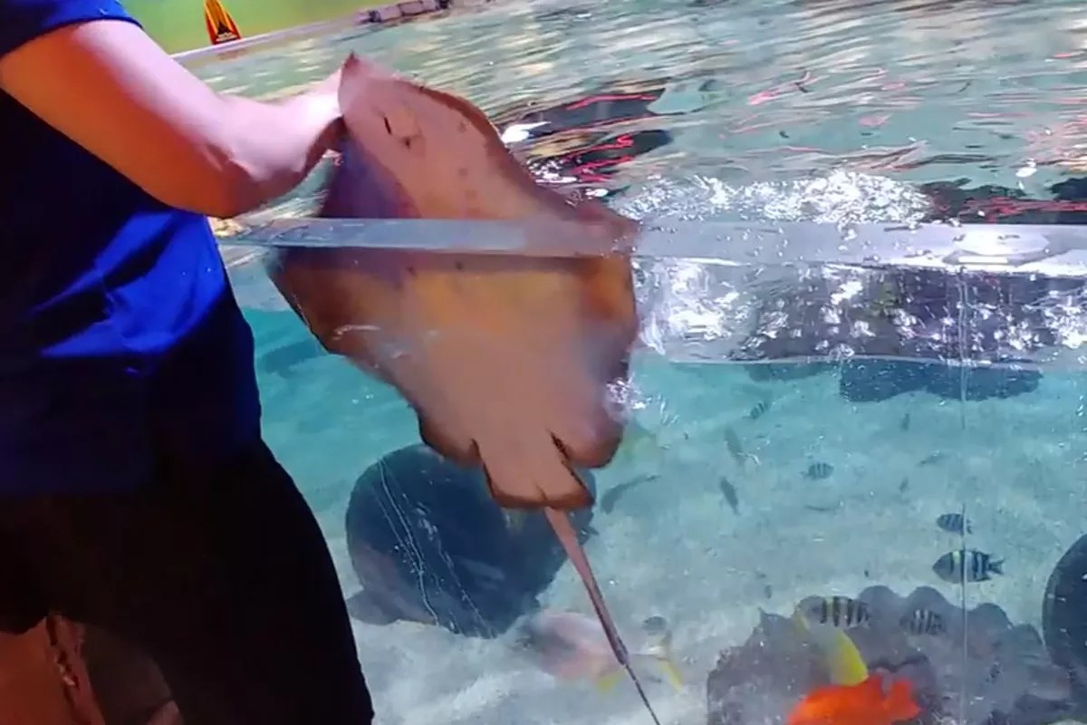 SeaQuest promo image of a staff member feeding a stingray at one of the company’s interactive aquariums.