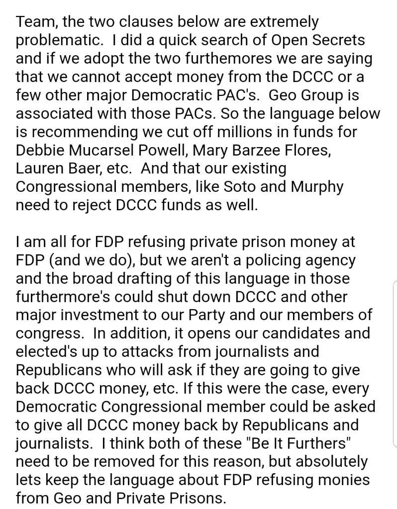 “The Florida Democratic Party did not take money from a private prison or a lobbyist associated with a private prison,” she writes in an email. “The party has not taken money from a PAC or an organization with a board member that is associated with or works for a private prison. The Florida Democratic Party will continue to follow in the spirit of this resolution, rejecting money from private prisons and lobbyists who work or associate with them.”