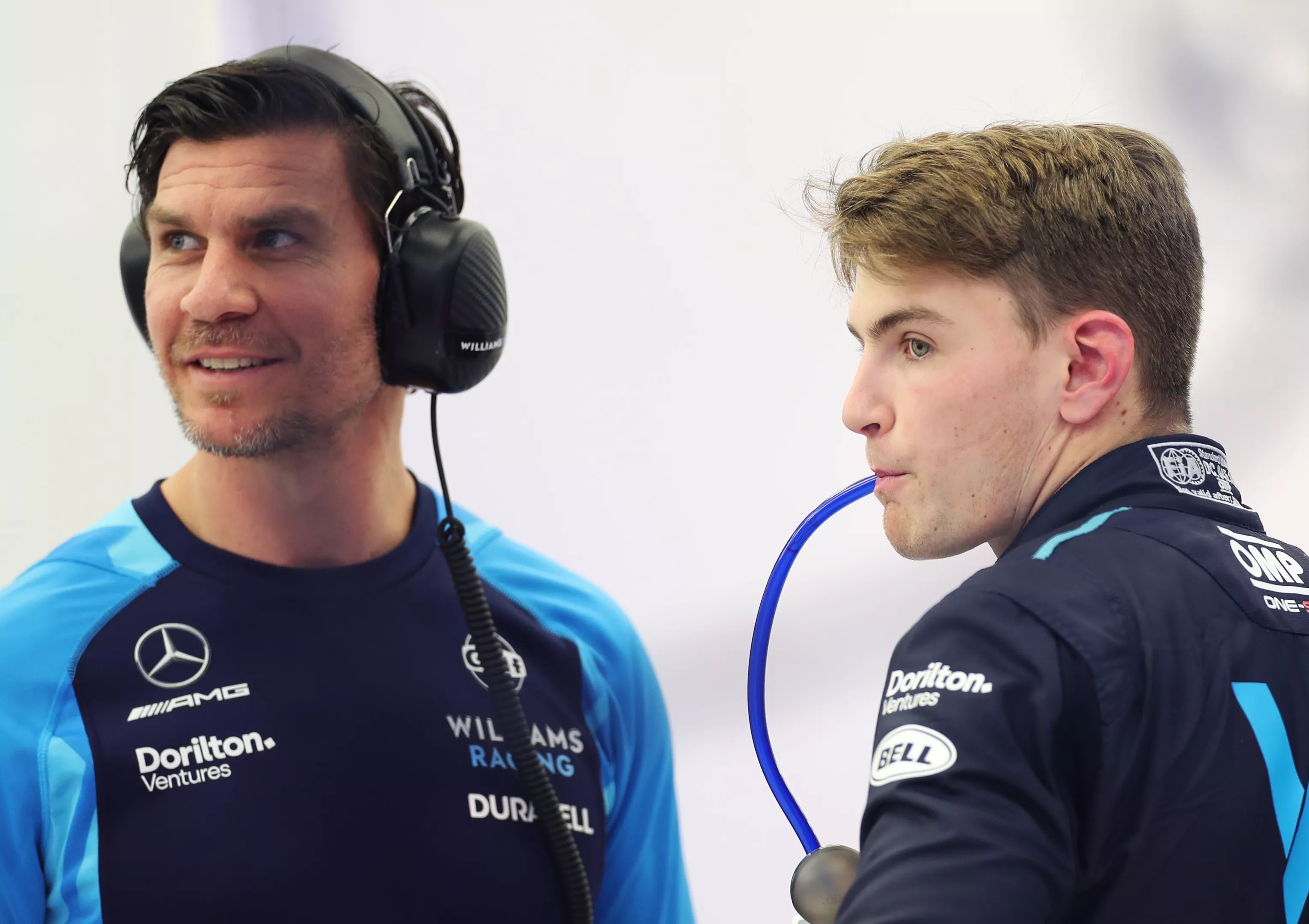 Logan Sargeant (right) of Williams racing looks on during day two of F1 Testing at Bahrain International Circuit on February 24, 2023 i